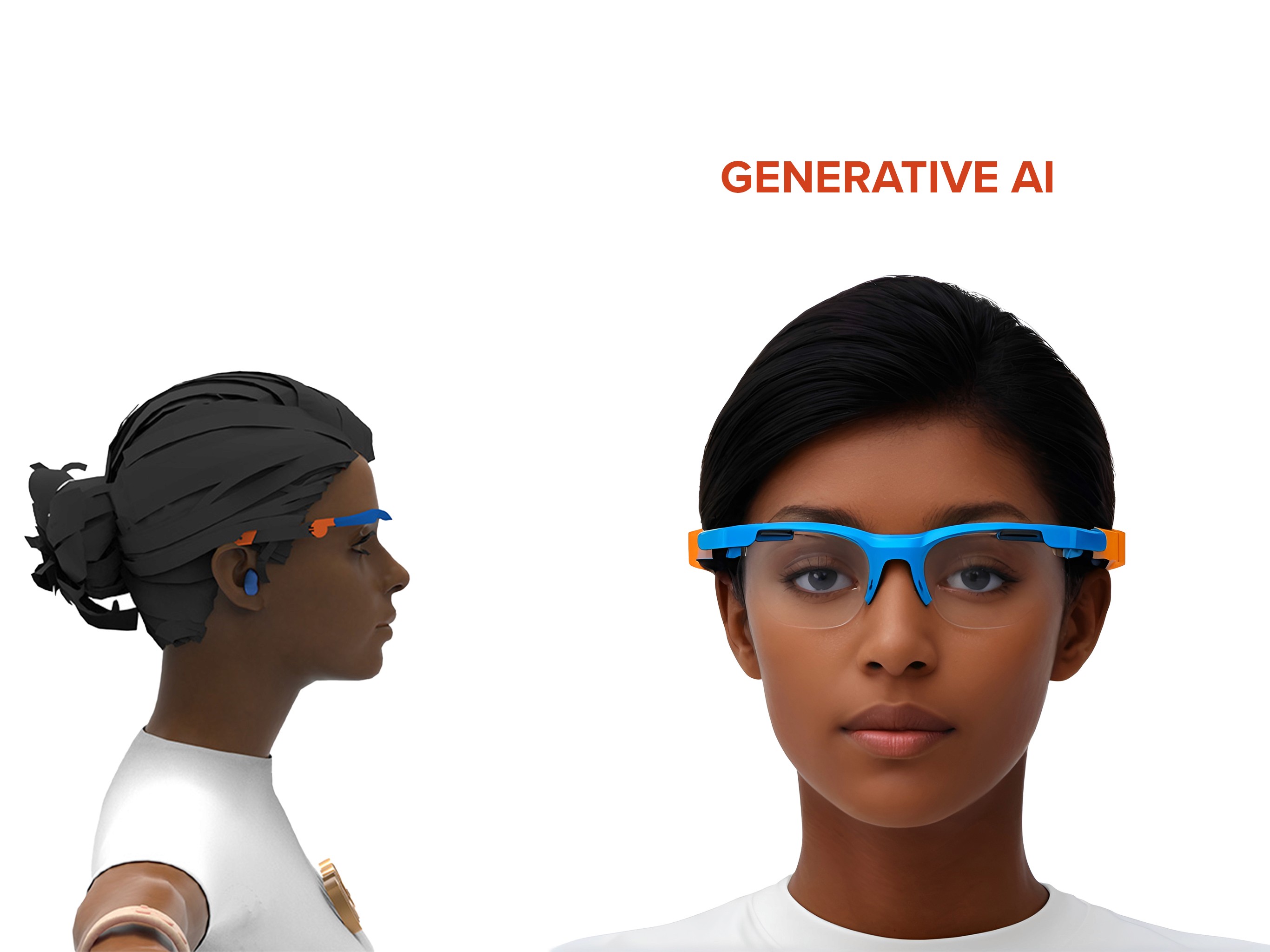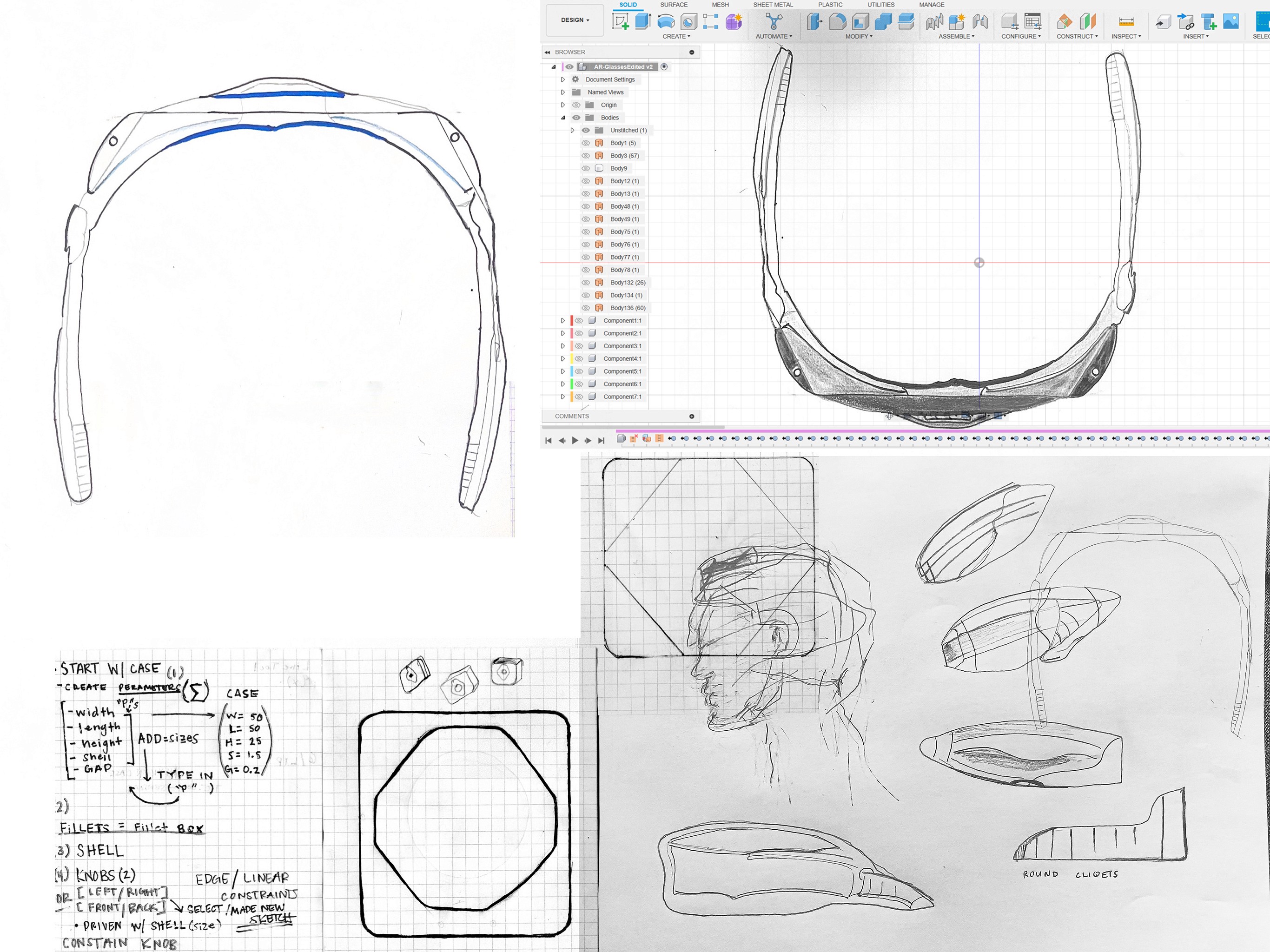 Research-driven conceptual AR glasses design with focus on ergonomic wearability and sleek aesthetics. Process included initial sketches, 3D modeling in SolidWorks and Fusion 360 using surfacing tools, KeyShot rendering, and generative AI concept exploration.
