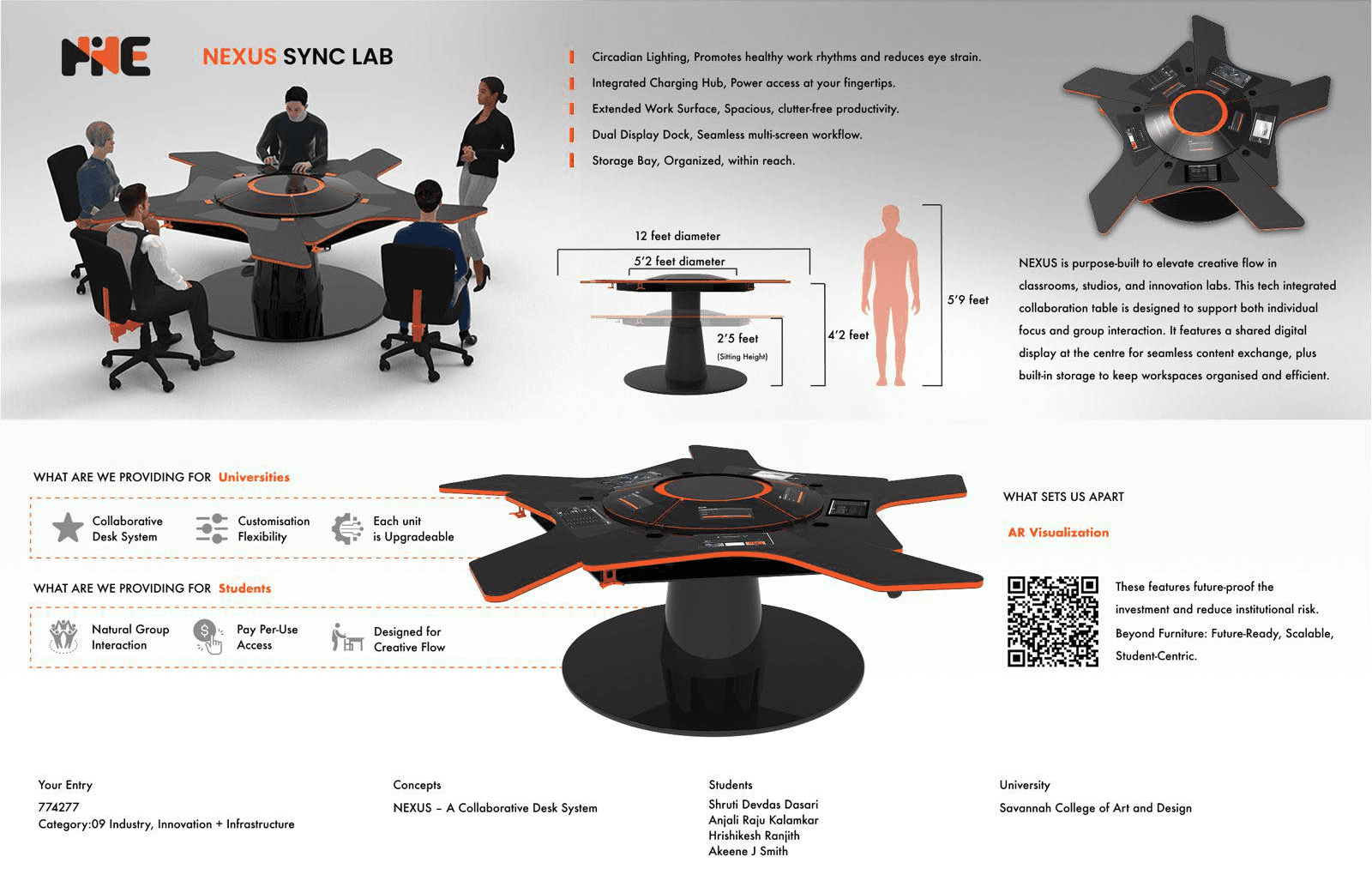 Nexus is a modular, tech-integrated workbench transforming traditional studio desks into adaptive tools for rapid, multi-modal student workflows. ---The Problem - Inadequate Power: 70% of students cite distant outlets as workflow disruptors. - Mobility Issues: 90% find standard desks difficult to move for group work. - Workflow Friction: Rigid tables fail to support switching between sketching, digital modeling, and prototyping. ---Core ID Work - Prototyping: Built physical models to test ergonomics and modularity. - Rendering (KeyShot): Created high-fidelity visuals for material and context communication. - Animation (KeyShot): Produced motion studies to demonstrate functional modularity.