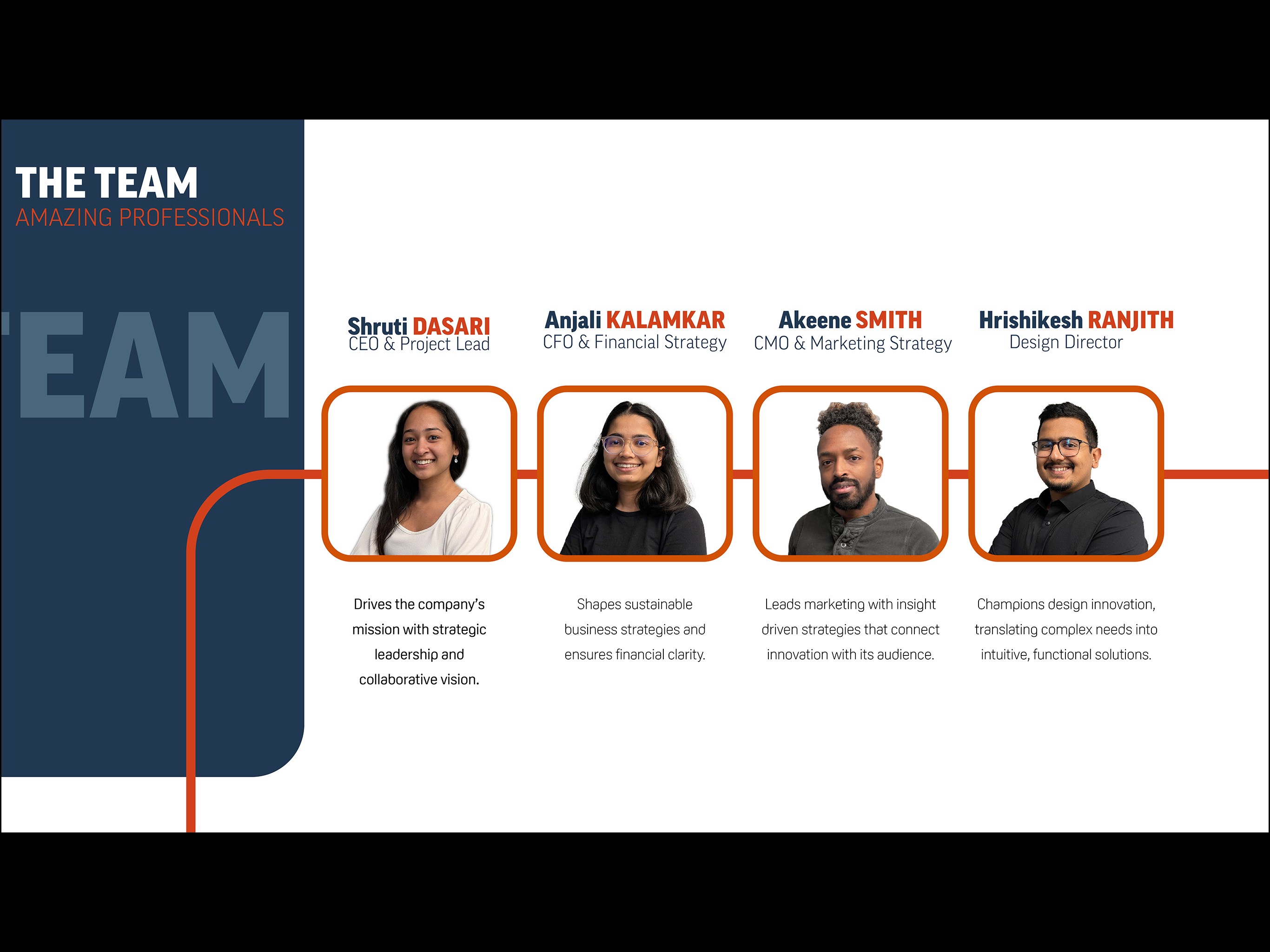 Group Project Team: Shruti Dasari (CEO), Anjali Kalamkar (CFO), Akeene Smith (CMO), Hrishikesh Ranjith (Design Director)
