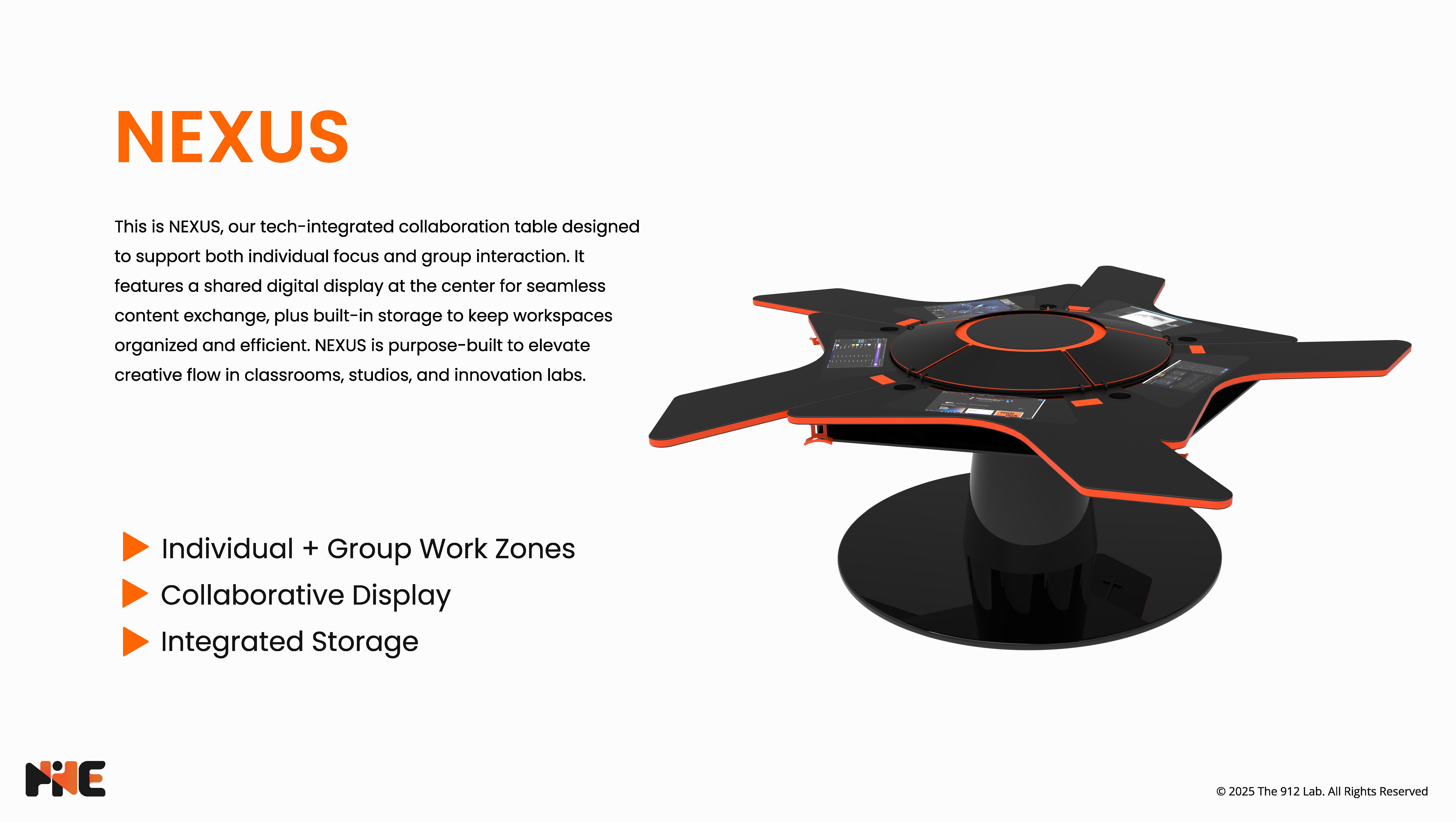 The 912 Lab’s Nexus Desk is a collaborative workstation system that transforms rigid classrooms into flexible, high performance creative studios. It solves students’ daily pain points of hard to move desks, distant power, and inadequate storage that disrupt collaboration, focus, and workflow. Users gain seamless charging, integrated storage, extended work surfaces, and multi screen support in a desk that quickly reconfigures from individual to group use. The jury should award it because it goes beyond furniture to deliver a scalable, data informed platform that integrates AR visualization, pilot testing, and ongoing faculty co-creation.